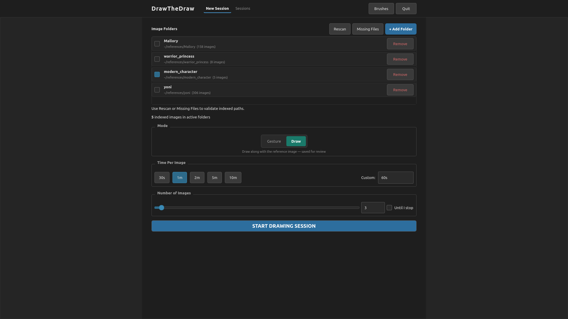 Practice with your own reference folders, run fast timed sessions, draw side by side, and review what you made afterward. No account, no cloud sync, no subscription.
